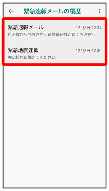 緊急速報メール受信メッセージ一覧画面が表示されます。