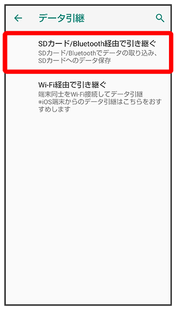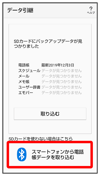 - SDカードが挿入されていないときや、SDカードにバックアップデータがないときは、取り込み元の携帯電話の選択画面が表示されます。画面に従って操作してください。