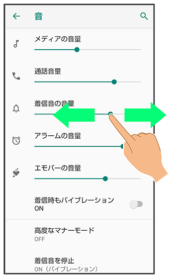 を右にドラッグすると音量が大きく、左にドラッグすると音量が小さくなります。