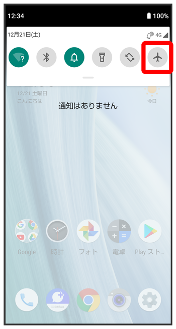Wi-Fi機能やBluetooth®機能が有効のときに機内モードに設定すると、その時点でそれぞれの通信が無効になります。データ通信中に操作すると切断されますので、ご注意ください。