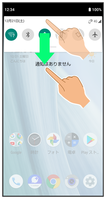 - 通知パネルが開いてない状態で、ステータスバーを2本の指で下にドラッグしても、クイック設定パネルが表示されます。