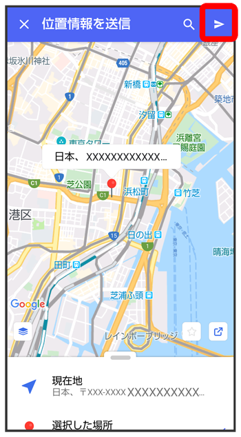 をタップすると位置情報が添付されたメッセージが送信されます。