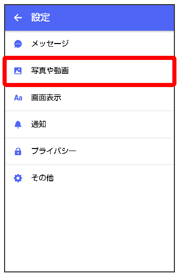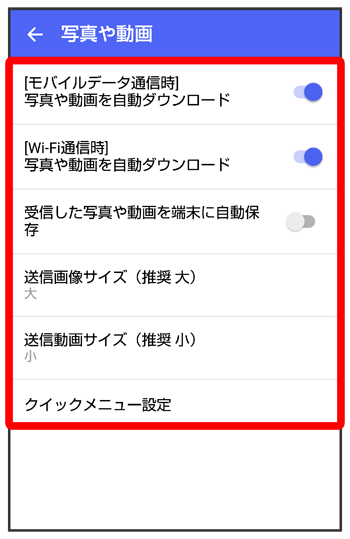 | [モバイルデータ通信時] 写真や動画を自動ダウンロード | モバイルデータ通信時に受信した写真や動画を自動でダウンロードするかどうかを設定します。 |
