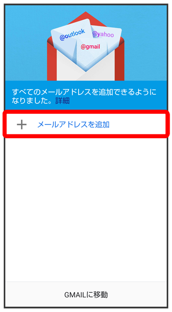 (Gmail)を起動すると、アカウント設定画面が表示され、設定操作を行うことができます。