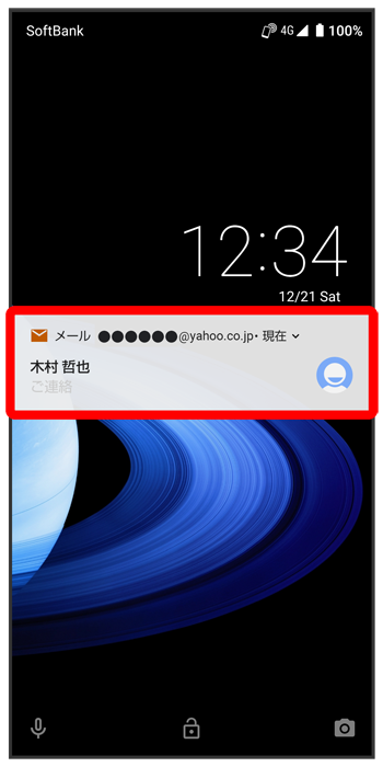 新着メールを受信すると、ロック画面に新着メッセージ通知が表示されます。