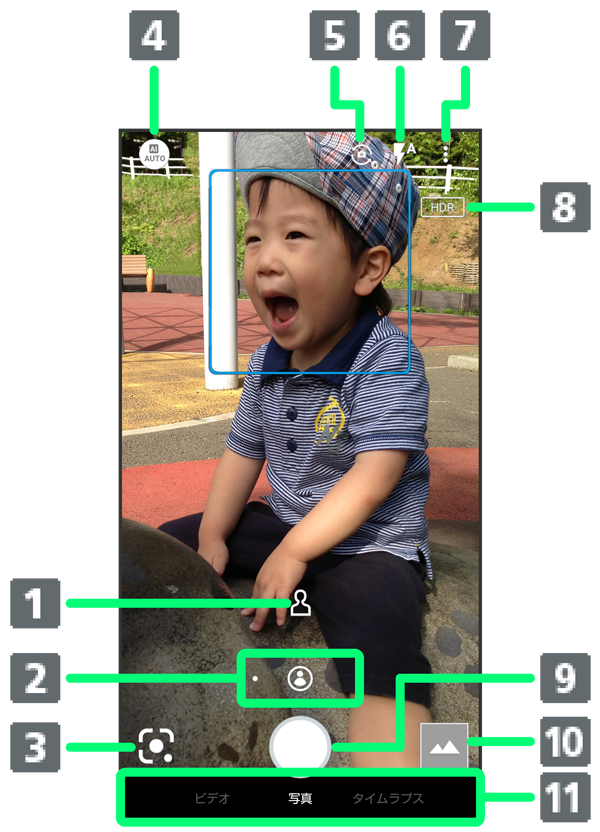 撮影時の各種設定を行います。詳しくは、「写真撮影の設定をする」、「動画撮影の設定をする」、「写真/動画撮影共通の設定をする」を参照してください。 - HDR表示2