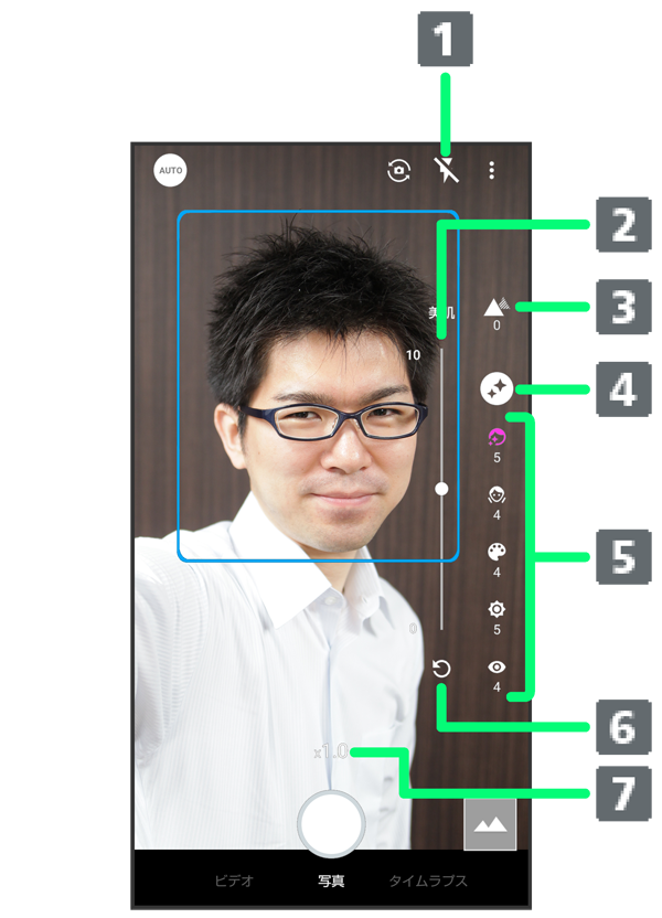 有効にすると、フラッシュの代わりに画面全体が発光し、夜の自撮りでも人物が明るく撮れます。 - 調節バー1