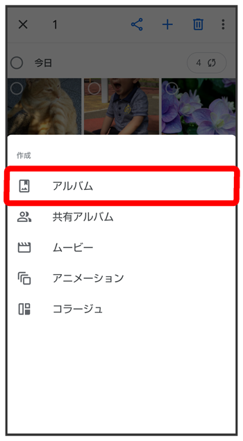 フォト画面で写真/動画を追加したいアルバムをタップ- 写真/動画をタップするたびに、選択(