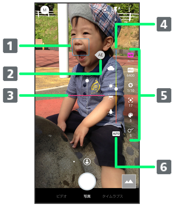 ホワイトバランスやISO感度などの設定ができます。 - オートアイコン