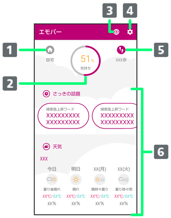 エモパー画面では、エモパーとあなたとのコミュニケーション度合いを確認したり、情報の登録や設定を行ったりすることができます。