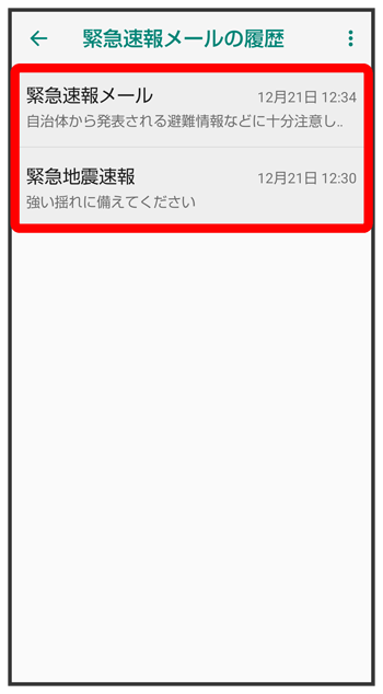 緊急速報メール受信メッセージ一覧画面が表示されます。