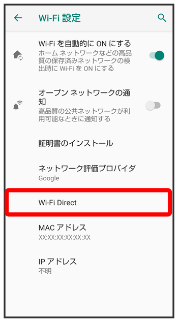 「ピアデバイス」欄に、近くにあるWi-Fi Direct規格対応機器が表示されます。