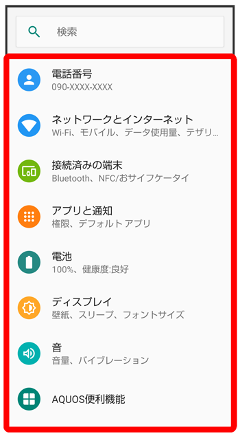 をタップすると、設定メニュー内の項目を検索できます。