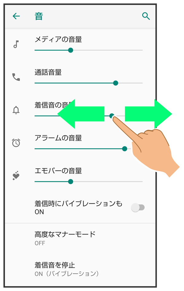 を右にドラッグすると音量が大きく、左にドラッグすると音量が小さくなります。