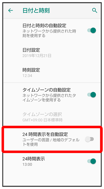 ユーザーの言語/地域の標準に従って24時間表示/12時間表示が自動設定されます。