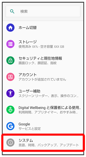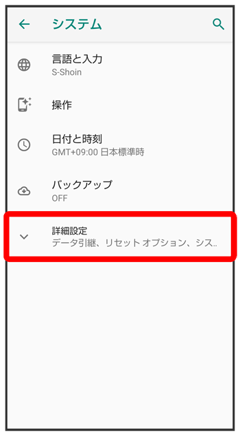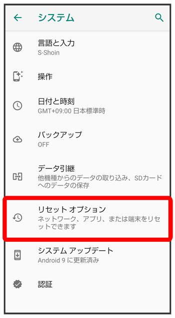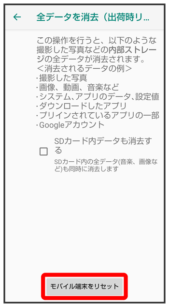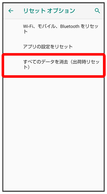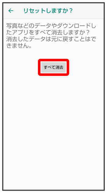 - すべてのデータを消去(出荷時リセット)を行うと、内部ストレージのデータがすべて消去されます。必要なデータは事前にバックアップをとることをおすすめします。