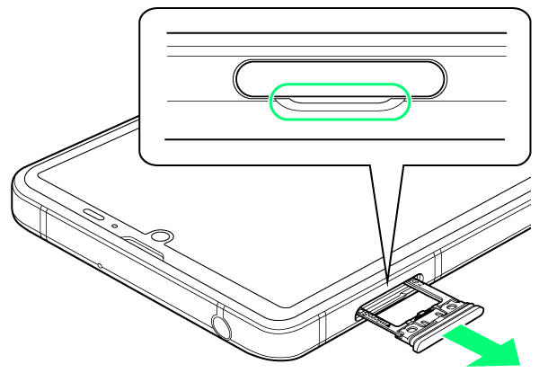 - ディスプレイを上にして、カードトレイを引き出してください。ディスプレイを下にしたり、本機を立てた状態でカードトレイを引き出すと、SIMカードやSDカードがカードトレイから外れ、紛失する可能性があります。