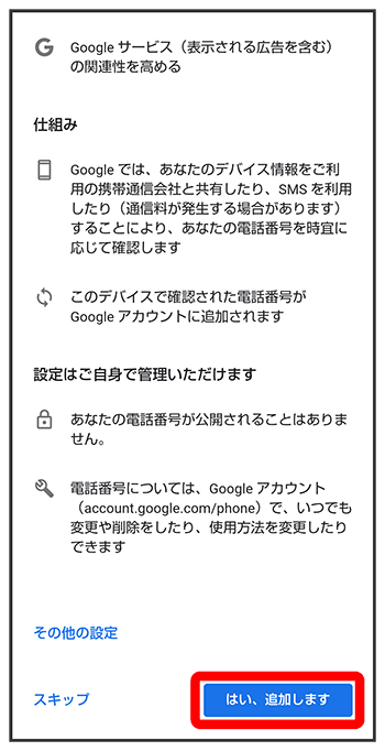 - セキュリティ保護目的でのみ電話番号を追加するときは、をタップします。以降は画面に従って操作してください。