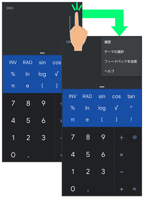 をタップすると、その画面で利用できる機能の設定や項目が画面に表示されます。