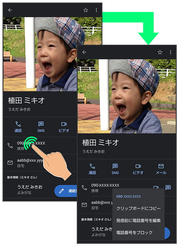 画面をロングタッチすると、利用できる設定や項目が表示される画面もあります。