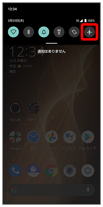 Wi-Fi機能やBluetooth®機能が有効のときに機内モードに設定すると、その時点でそれぞれの通信が無効になります。データ通信中に操作すると切断されますので、ご注意ください。