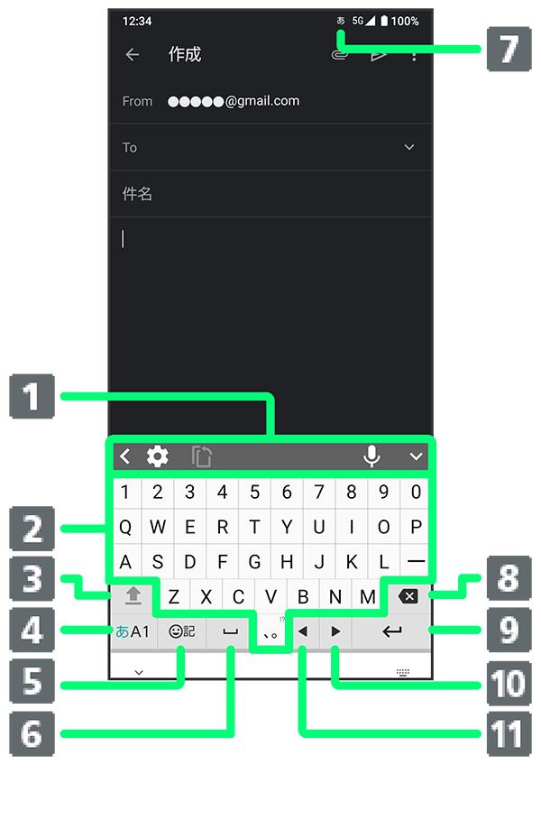 - 絵文字/記号/顔文字を入力(ロングタッチすると、入力拡張プラグインを表示。文字入力中は、カタカナ/英字変換3)