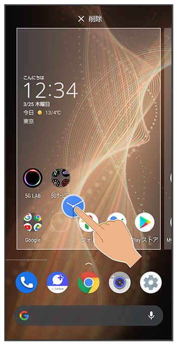 ホーム画面でフォルダをロングタッチ「削除」までドラッグ- お気に入りトレイでも同様に操作できます。