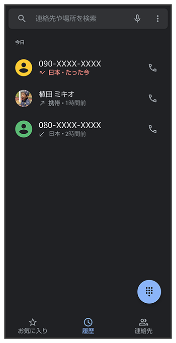通話履歴一覧画面で確認する相手の名前/電話番号をタップ履歴詳細画面が表示されます。