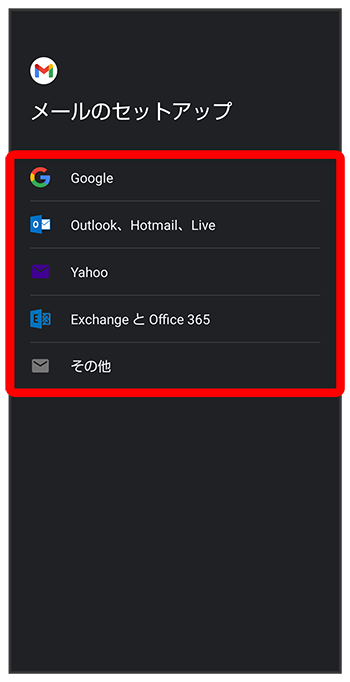 - すでにGoogle アカウントでログインしている場合は、アカウント設定画面は表示されません。別のアカウントを追加するときは、「アカウントを追加する」を参照してください。