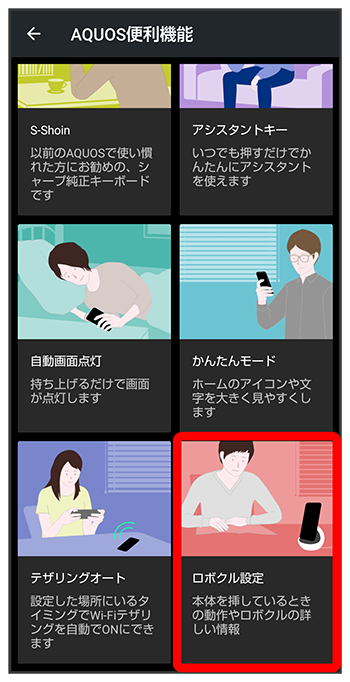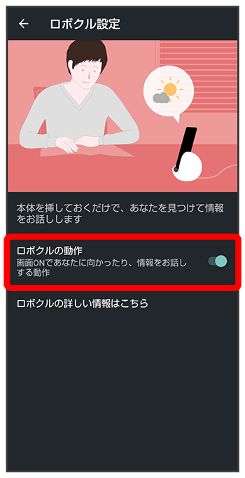 - 有効にすると、本機の電源が入っているとき、ロボクルで充電すると、ディスプレイ点灯時や充電開始、着信、アラームなどに連動してロボクルが回転します。