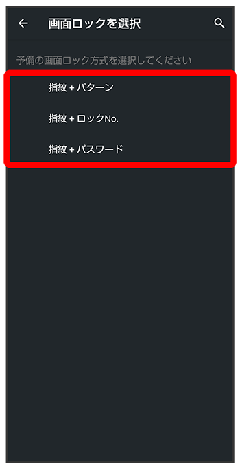 予備で設定した画面ロック解除用のパターン/ロックNo.(PIN)/パスワードはお忘れにならないようご注意ください。