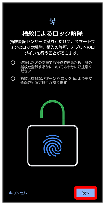 画面に従って画面ロック解除用のパターン/ロックNo.(PIN)/パスワードを設定