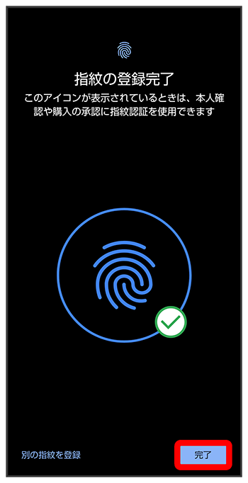 - 指紋の登録完了画面が表示されるまで繰り返してください。