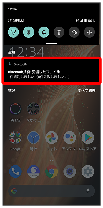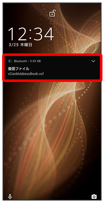 が表示されます。ステータスバーを下にフリックしてBluetooth®共有通知をタップしてください。
