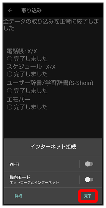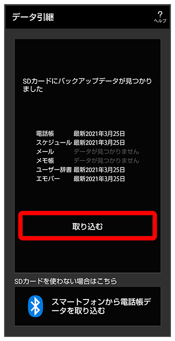 ほかの機器や本機でSDカードに保存したデータ(電話帳、スケジュール、ユーザー辞書/学習辞書(S-Shoin)、エモパー)を、本機に取り込むことができます。