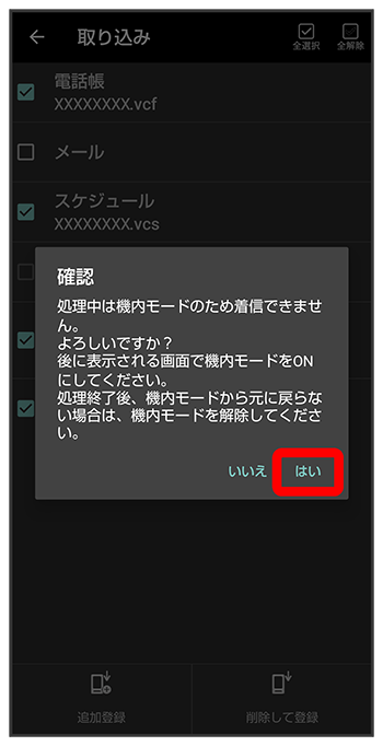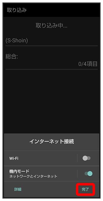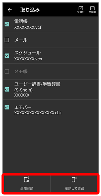 ユーザー辞書/学習辞書(S-Shoin)を取り込む場合、内部ストレージに保存されているユーザー辞書/学習辞書(S-Shoin)のデータが削除されますのでご注意ください。