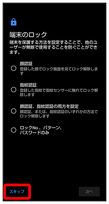 - 画面ロック解除方法をタップと操作すると、選択した画面ロック解除方法の設定ができます。詳しくは、「指紋認証機能を利用する」、「パターンを指でなぞって画面ロックを解除するように設定する」、「ロックNo.(PIN)で画面ロックを解除するように設定する」、「パスワードで画面ロックを解除するように設定する」、「顔認証機能を利用する」を参照してください。