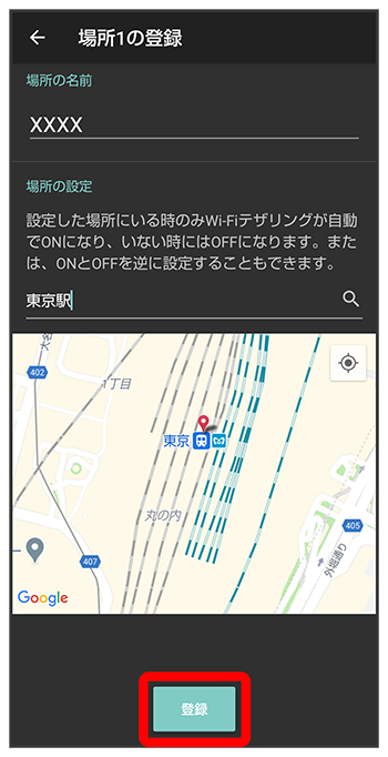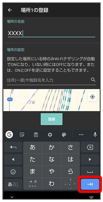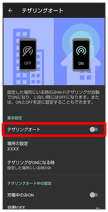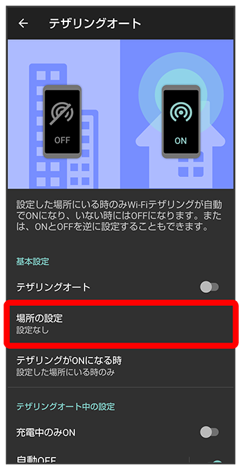 テザリングオート画面で削除したい場所のWi-Fiテザリングが有効になるタイミングを設定する