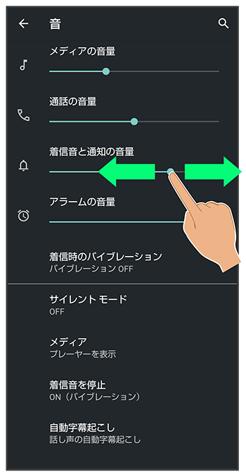 を右にドラッグすると音量が大きく、左にドラッグすると音量が小さくなります。