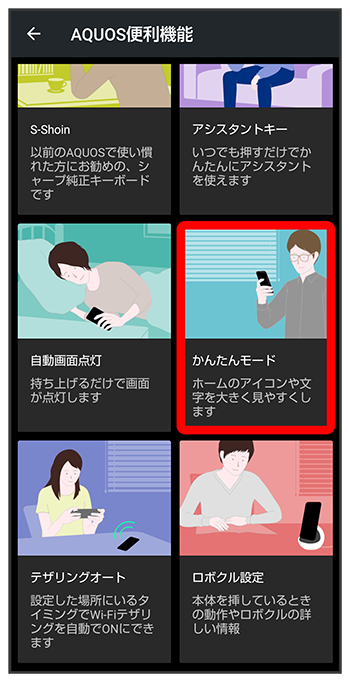 かんたんモード画面でホーム画面や文字の大きさなどを個別に設定する
