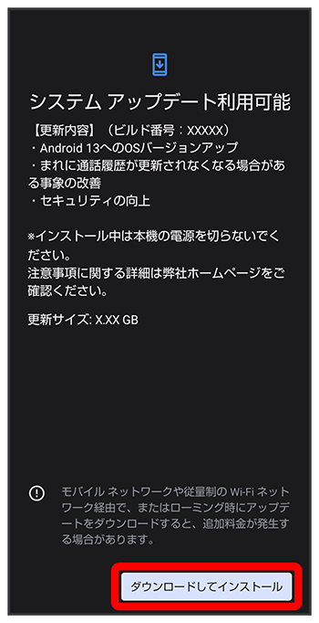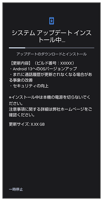 - システムアップデート中もほかの機能を使用できます。ただし、システムアップデートの通知後10日間は、システムアップデート中にほかの機能を使用していると、アップデートのインストールが一時的に停止されます。をタップすると、インストールが再開され、ほかの機能も使用可能になります。