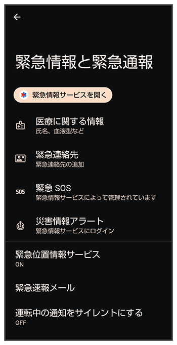 | 緊急SOS | が追加されます。 を有効にすると、緊急SOSについて詳細に設定できるようになります。 が追加されます。 がに変更されます。 が追加され、緊急時の位置情報などを緊急連絡先に共有するかどうかなどを設定できます。あらかじめGoogle アカウントにログインし、緊急連絡先や権限を設定しておいてください。 が追加され、緊急時に動画を撮影するかどうかなどを設定できます。あらかじめGoogle アカウントにログインしておいてください。 そのほかの項目が一部変更されます。 |