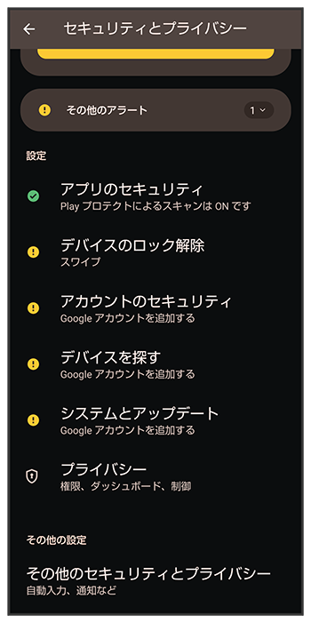 | アカウントのセキュリティ | 項目が追加され、本機や、ログイン中のGoogle アカウント、Google アカウントに保存したパスワードのセキュリティに問題ないかを確認できます。 |