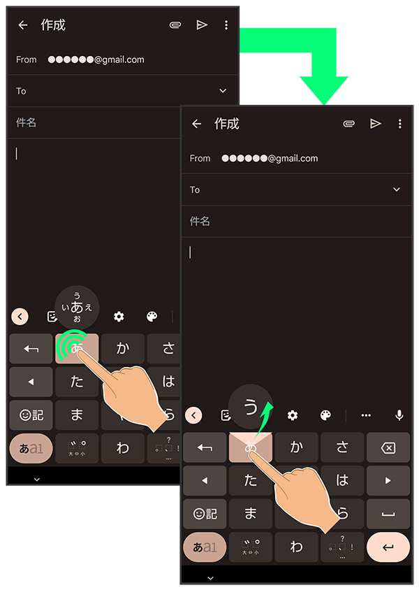 - キーをロングタッチすると、キー入力ガイドがポップアップで表示されます。キーをタップしたまま入力する文字の方向へフリックし、入力します。