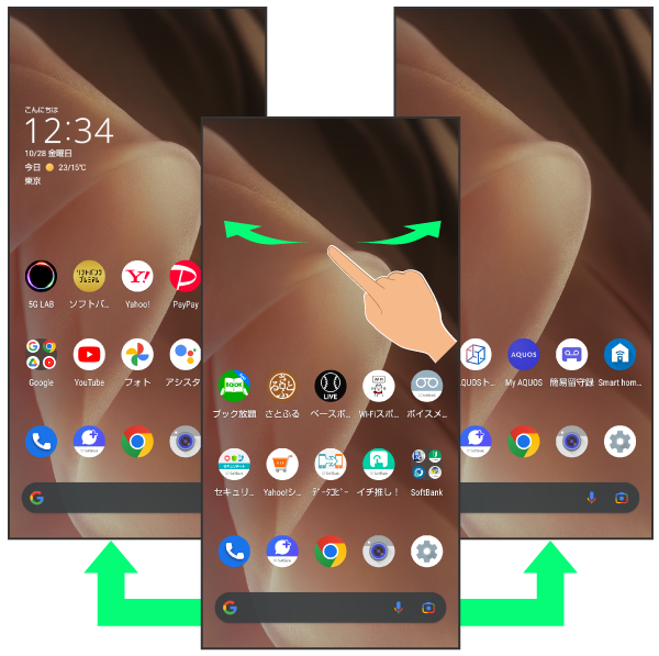 各シートを左右にフリックすると、ホーム画面シートを切り替えることができます。