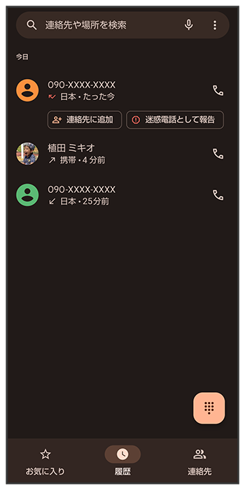 通話履歴一覧画面で確認する相手の名前/電話番号をタップ履歴詳細画面が表示されます。