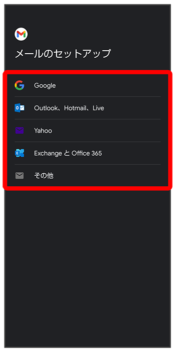 - すでにGoogle アカウントでログインしている場合は、アカウント設定画面は表示されません。別のアカウントを追加するときは、「アカウントを追加する」を参照してください。
