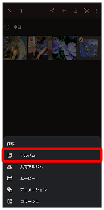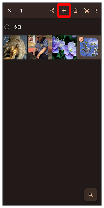 フォト画面で「アルバム」欄から写真/動画を追加したいアルバムをタップ追加したい写真/動画をタップ(- 写真/動画をタップするたびに、選択(