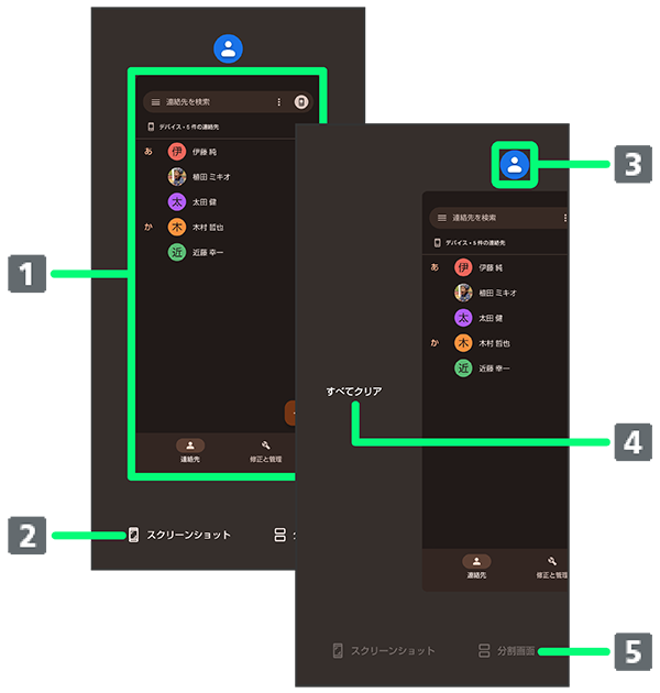 アプリの使用履歴画面で画面に従って操作- アプリの使用履歴画面でアプリの履歴のアイコンをタップと操作しても画面を分割できます。