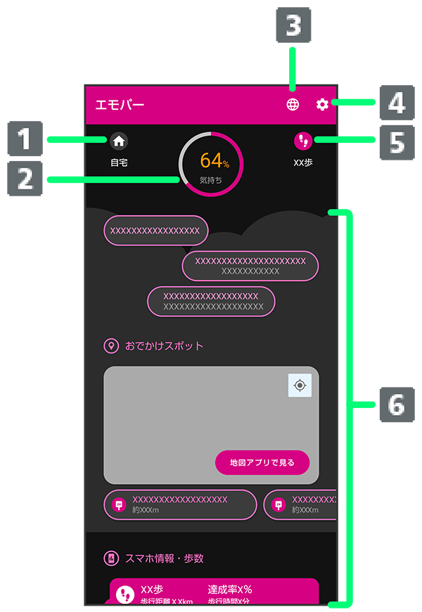 エモパー画面では、エモパーとあなたとのコミュニケーション度合いを確認したり、情報の登録や設定を行ったりすることができます。